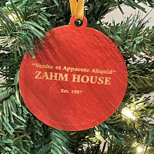 (This Zahm House Christmas Ornament is made from stained birch, laser-engraved, and is 3.25" in diameter. We will attach a hanging ribbon and it comes in a white gift box.)