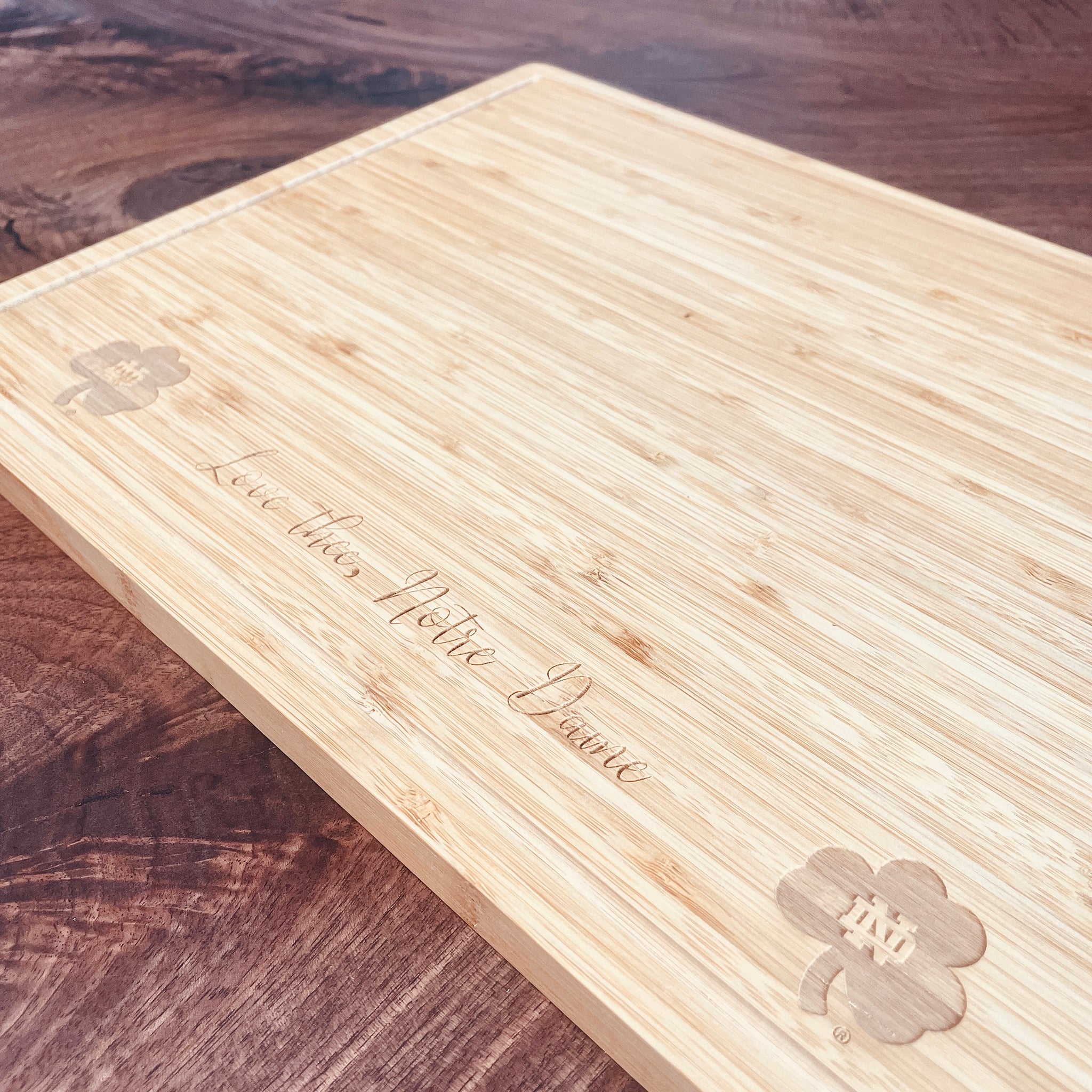 The board is crafted from high-quality bamboo and has both a grooved and a flat side. Coloration of each Notre Dame Cutting Board may vary due to the manufacturing process.